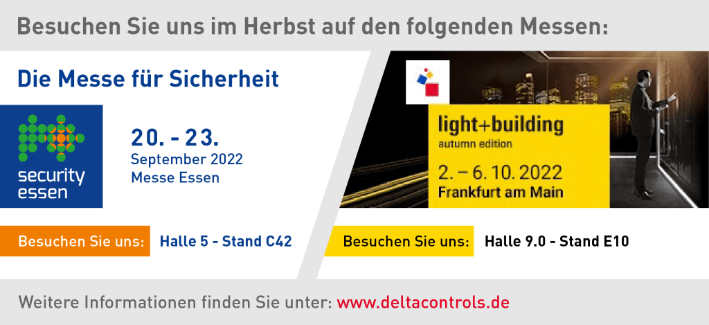 Delta Controls Germany auf den Herbstmessen: Messe security 2022 in Essen und Light and Building 2022 in Frankfurt